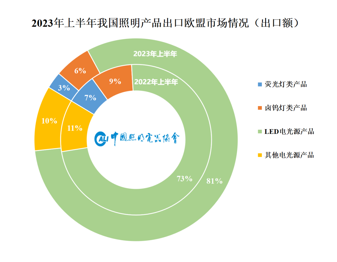 2023年1-6月,我国照明产品输入欧盟市场出口额为49亿美元,同比下滑14%。今年以来,欧盟市场加快淘汰荧光灯、卤钨灯等高耗能传统照明产品,用以推广LED电光源产品。荧光灯类产品和卤钨灯类产品在欧盟市场出口额占比下滑约7个百分点,LED电光源产品上升约8个百分点。