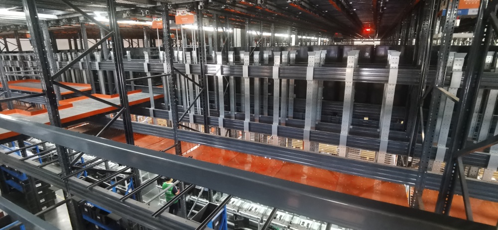 智能立体仓储系统,上方橙色方块为正在搬货的“蜘蛛机器人” 新京报贝壳财经记者罗亦丹 摄