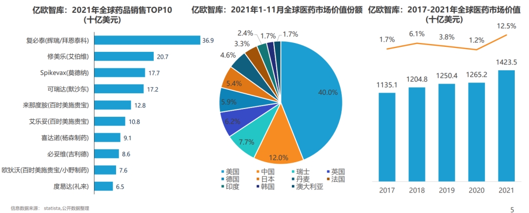 2021年,辉瑞-拜恩泰科的mRNA新冠疫苗复必泰以369亿美元的销售额位居全球药品销售额之首,艾伯维的阿达木单抗注射液修美乐紧随其后,销售额达207亿美元。全球药品销售额前10的药品包括新冠疫苗、单抗药物和化疗药物等;美国为全球最大医药市场,占据40%的市场份额,中国以12%的份额排名第二,瑞士第三 (7.7%);2017年至2021年,全球医药市场价值逐年上升,经历增幅放缓后,2021年的增长幅度达到12.5%。