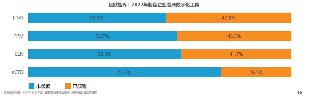 随着我国医药创新的不断发展,包括海外多中心的临床试验数量不断增加,医药研发作为技术密集型领域,其过程涉及临床数据管理、项目进程管理、保证数据合规性以及对接海外上市注册申请文件的标准管理等。数字化系统能够帮助企业对上述的过程进行规范管理提升工作效率。LIMS能够帮助制药企业提升数据的规范性,便于人员检索提升工作效率,根据数据显示,当前有47.5%的企业部署了LIMS,其选择的主要厂 家为Labware及赛默飞。PPM能有效管理从研发项目的任务分解到各子项目进展的全生命周期提供动态的项目全局视图和实时联动的信息以便 管理者加强监管,根据数据显示,当前有43.3%的企业部署了PPM,部分药企仍通过ERP系统(多为SAP、金蝶、用友等)中的相应模块或其 他方式进行研发项目生命周期管理。随着纸质的实验记录已无法满足实验过程的规范化、质量管理,且纸质数据难以检索分析,ELN应运而生, 根据数据显示,当前有41.7%的企业部署了ELN,其选择的主要厂家包括上海鹰谷、Labware及明度智云。eCTD能够帮助企业高效、便捷地完 成药品的注册申报,对新药上市意义重大,根据数据显示,当前仅有26.7%的企业部署了eCTD ,其选择的主要厂家包括Medidate及明度智云。