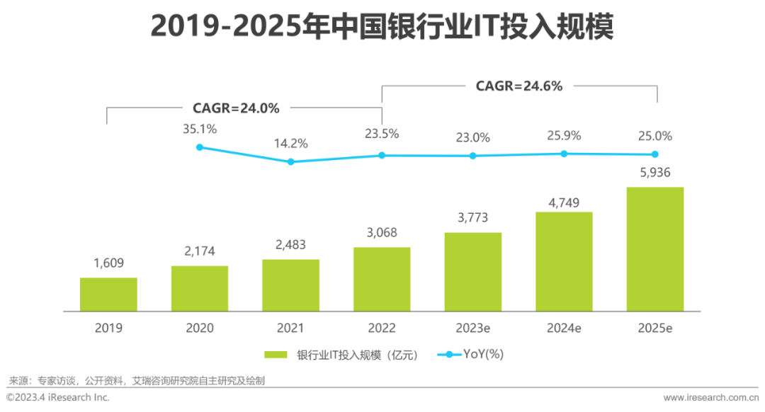 随着国家数字化转型系列政策的出台及前沿技术在金融服务领域应用的逐步成熟,银行数字化转型已经成为国内商业银行发展的大势所趋。近年国内银行业在IT建设与服务领域的资金投入规模逐年递增,自2019年起银行业IT投入规模以24%的复合增长率稳定高速增长,在2022年突破3000亿元,预计未来国内银行业IT投入规模仍将以约24.6%的复合增长率保持高速增长态势,于2025年达到接近6000亿的规模投入。