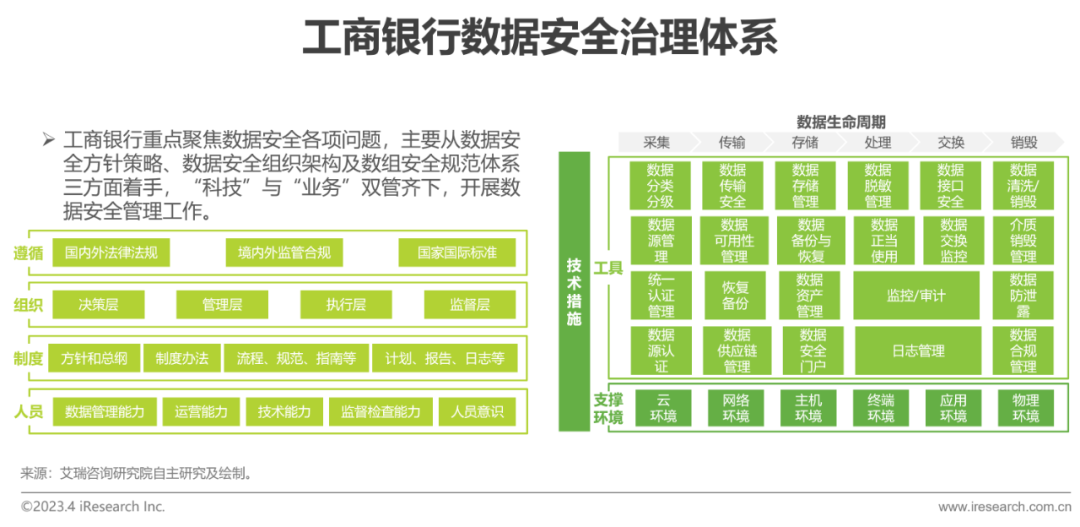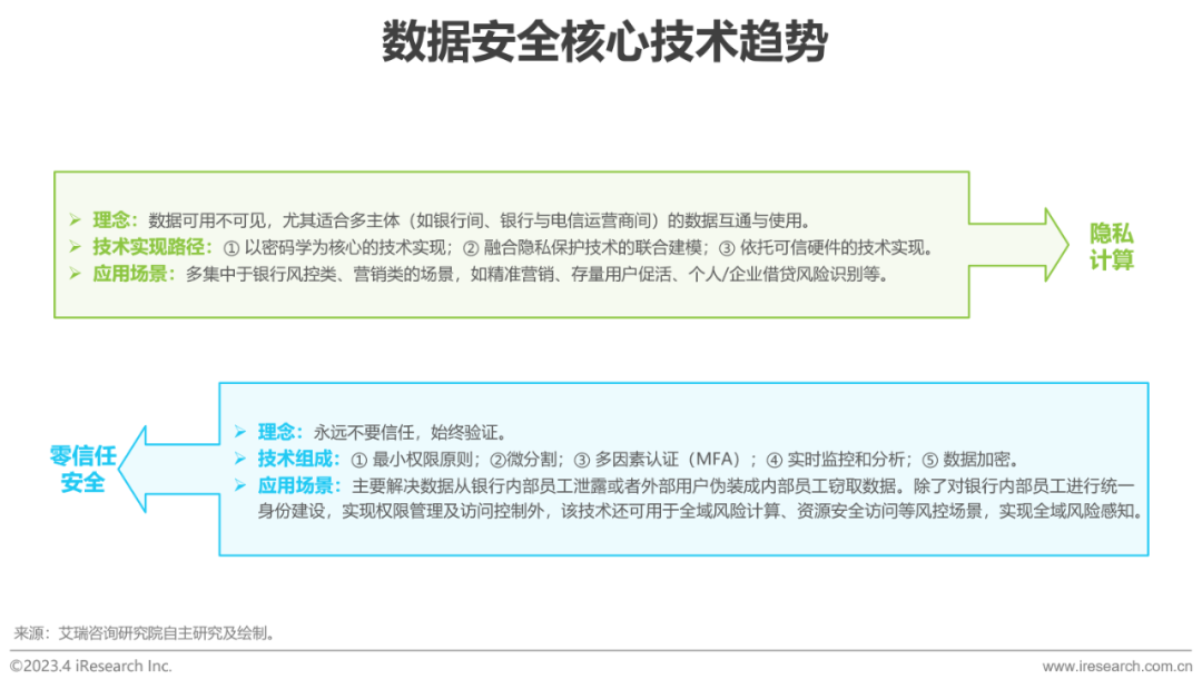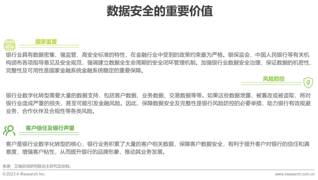 数据安全是银行数字化转型重要的底层结构支撑。从国家和监管层面看:数据安全是金融系统稳定的重要保障,也是银行合规的重要考评标准。从银行自身风险看:数据安全是反欺诈和自身稳定运营的关键。从用户服务和声誉度看:数据安全可有效保障用户隐私,维护银行声誉。数据安全技术体系复杂,但根据目的,可以分为:(1)保障数据不被丢失,具体包括容灾、备份等技术。(2)保障数据不被篡改,具体包括防火墙、访问控制、监控和审计。区块链技术等。(3)保障数据不被泄露,具体包括加密技术、隐私计算、数据遮蔽等。数据安全大致可有两个方向:对数据本身进行控制(类似于强制存取控制)和对用户进行控制(类似于自主存取控制),前者属于狭义数据安全,后者与网络安全等关系密切,属于广义数据安全,两者相互配合,缺一不可。