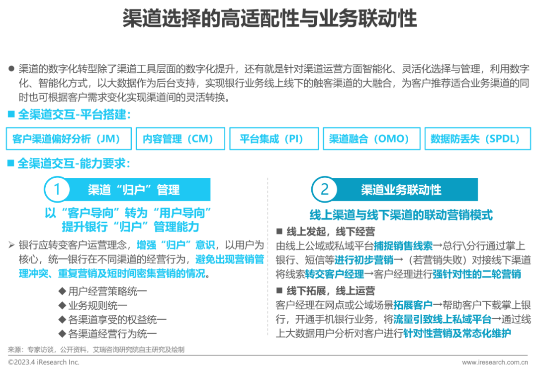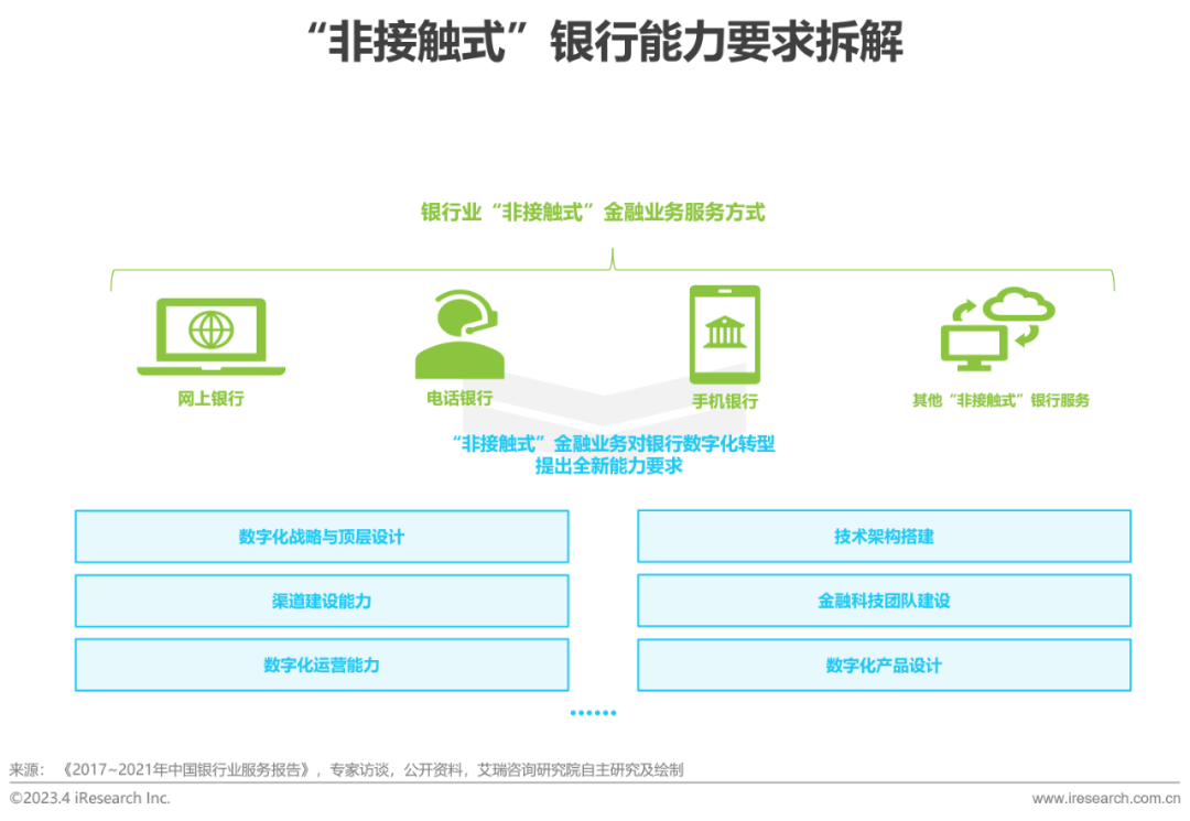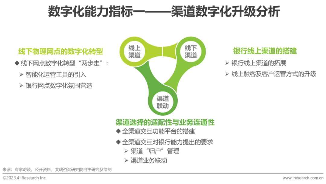 渠道建设作为银行业务的基础环节,其数字化转型的效果将直接影响银行在营销、产品、风控等其他领域的数字化表现。构建数字化渠道、实现渠道间智慧联动不仅是银行数字化转型过程中的优先选项,其对于银行业务的发展及数字化转型效果的呈现都是不可或缺的关键部分。银行的渠道数字化能力主要体现在三个方面,分别是银行线下网点数字化转型、线上数字化渠道建设以及渠道间的联动互通,后续内容将围绕以上三方面开展对于银行渠道数字化建设能力的分析。