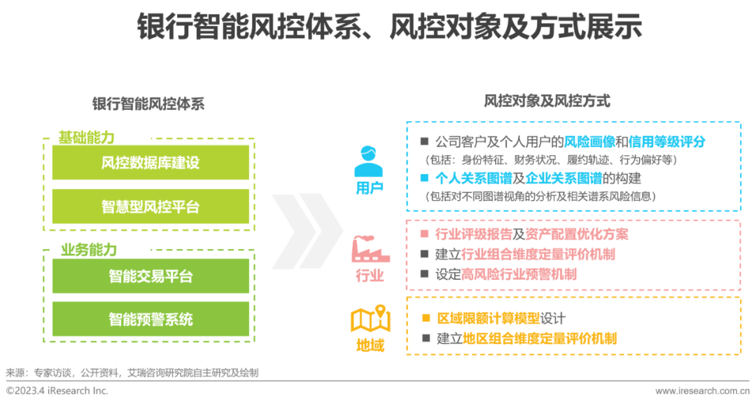 银行风险管理领域的数字化升级是整个银行系统数字化升级的核心部分,风控作为银行业务能力提升的重要辅助环节,其核心工作原理就是通过分析处理历史数据,得出风险等级并展望未来风险变动趋势。通过将大数据、人工智能、云计算等前沿技术与银行风控业务的汇总融合,帮助银行风控流程实现线上化、数字化、智能化,全面提升银行对于客户、行业及地域的风险把控能力,帮助银行在客户资格审核及贷款批复、资产管理及投资组合构建等方面降低风险水平,提升银行整体业务效果。银行智能风控体系搭建主要由基础能力及业务能力两个核心部分组成,基础能力体现在对于银行集团级风控数据信息库的建设以及智慧型风控平台的搭建上,业务能力主要包括对于银行智能交易平台及智能预警系统的使用。