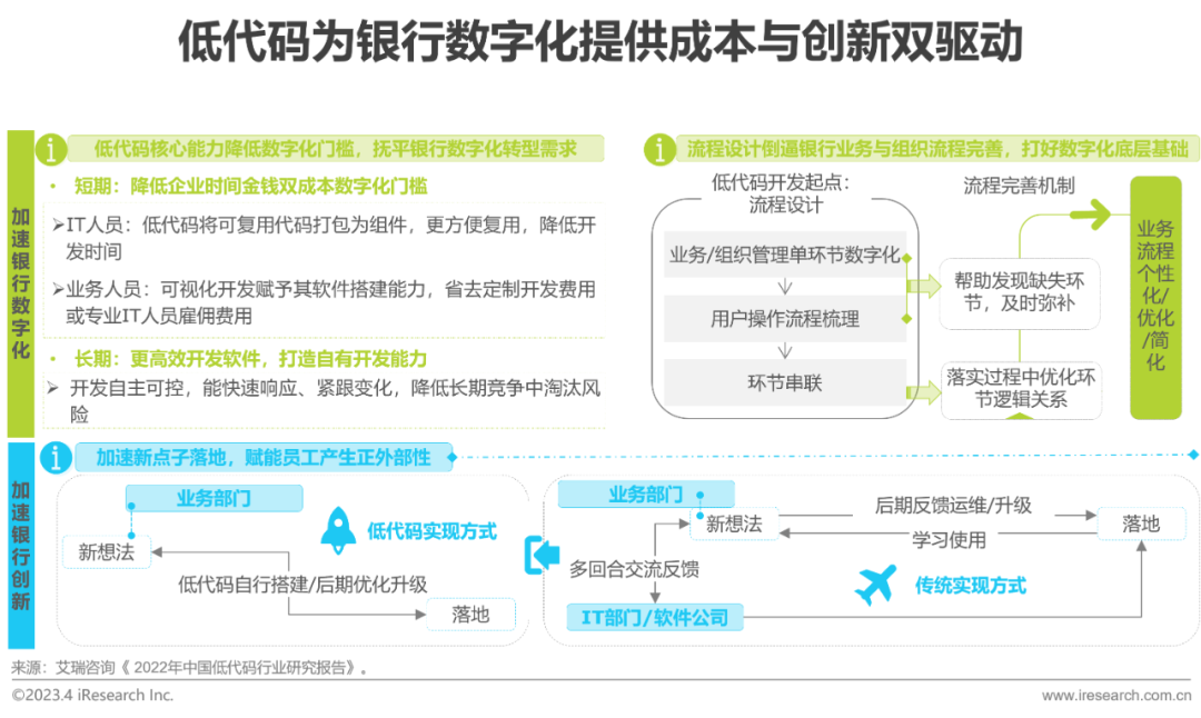 中短期来看,低代码不仅赋能IT人员,提高复用及开发效率,同时赋能于银行业务人员,便于软件的自主搭建,降低数字化门槛。长期视角中,低代码平台将企业需求与自主开发深度融合,打造出可持续性的、紧跟变化的IT服务能力来经受瞬息万变的时代考验。但银行要在时代洪流中屹立不倒,仍需保持创新动力,而低代码赋予普通业务人员的开发技能可以促进新点子变现,激发员工创新,赋能银行探索第二甚至是第三曲线的描绘可能。