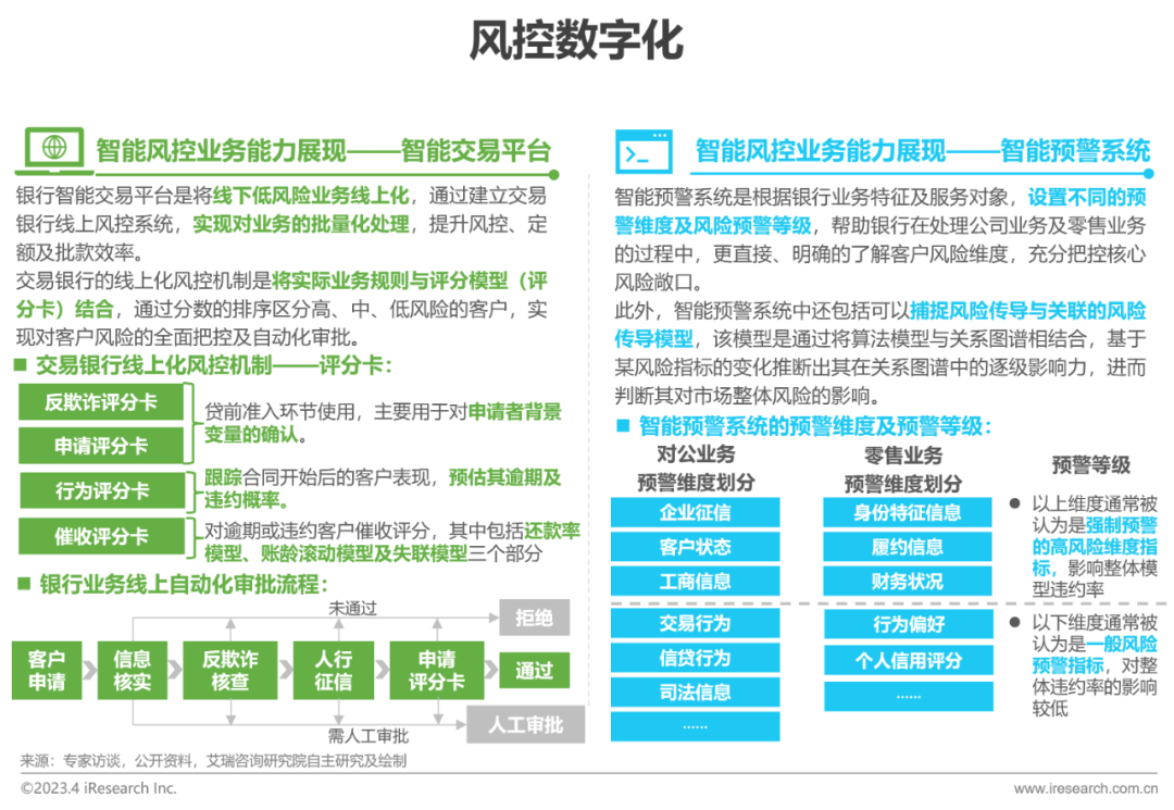 银行智能风控业务能力主要体现在智能交易风控平台建设与智能预警系统使用两个方面