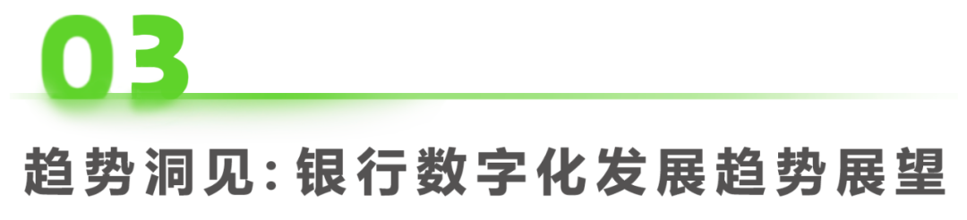 从整个银行业金融科技赋能程度与数字化转型阶段来看,目前大多数国内银行仍处于转型1.0的线上化阶段,处于该阶段的银行数字化能力比较薄弱,在实现业务线上化的基础上,仅在少数几项业务板块(如:营销、风控等)探索性开展数字化业务的能力升级。对于头部大行来说,目前基本已经进入了银行数字化转型的2.0阶段,银行在业务数字化转型及应用方面的能力较为完整,对于银行业务场景也实现了一定程度的数字化覆盖,并且在某些业务条线,头部大行的技术能力应用也能够达到数智化初级水平。随着国内银行业在金融科技、IT系统建设等数字化领域投入成本的增加,银行数字化业务服务能力水平将进一步提升,前沿技术的融入将推动银行整体迈入数字化新阶段。与此同时,银行数字化转型进程的推进也将逐步覆盖更多的业务条线,特别是线上化难度大、业务较为复杂的对公业务条线,或将成为近几年数字化升级的重点发力方向。此外,银行数字化升级的业务板块也将会更多的关注用户体验与用户服务,将数字化、智能化技术应用于解决用户投诉、保护用户权益、产品智能决策等方面,在满足用户需求的同时利用数字化技术为用户带来更好的服务体验。