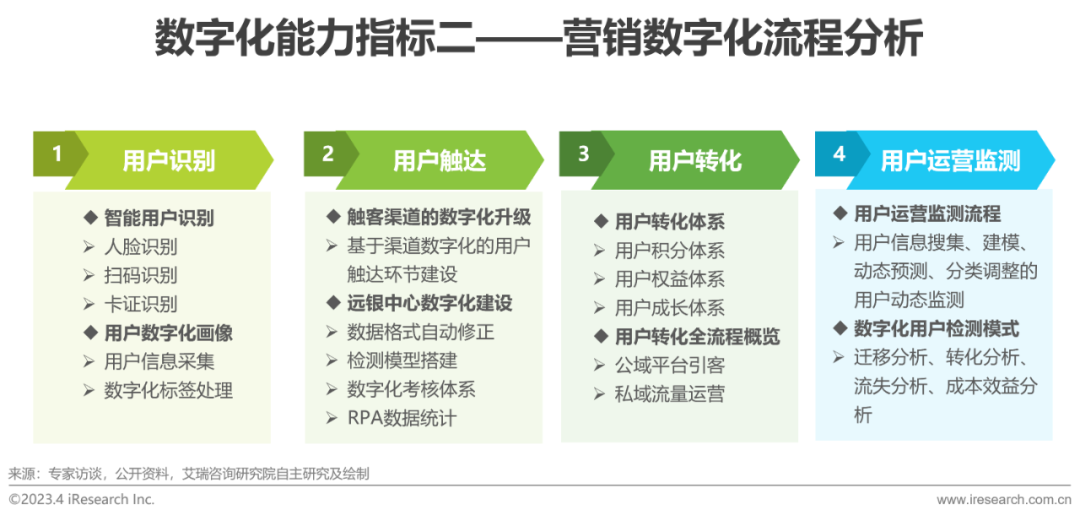 营销数字化作为在银行数字化能力建设中优先度、重要度与能力展现效果均位列前位的银行数字化能力评测指标,其对于银行整体的数字化升级效果的展现与影响力是不言而喻的。由于该项能力数字化升级效果易量化,银行受益直接,对于银行营销体系的数字化升级通常是银行“试水”数字化的第一步。营销数字化的核心是将传统银行业务由“客户导向”转变为“用户导向”,整个数字化营销流程全面围绕用户展开,以单个用户的实际需求为核心,结合大数据、云计算、人工智能等技术,精准刻画用户画像,全面捕捉用户生命周期。银行营销能力数字化升级按照其用户运营流程被分为四个阶段,依据每个阶段不同的业务重点,针对性的部署各业务环节的数字化升级模式,具体情况如下: