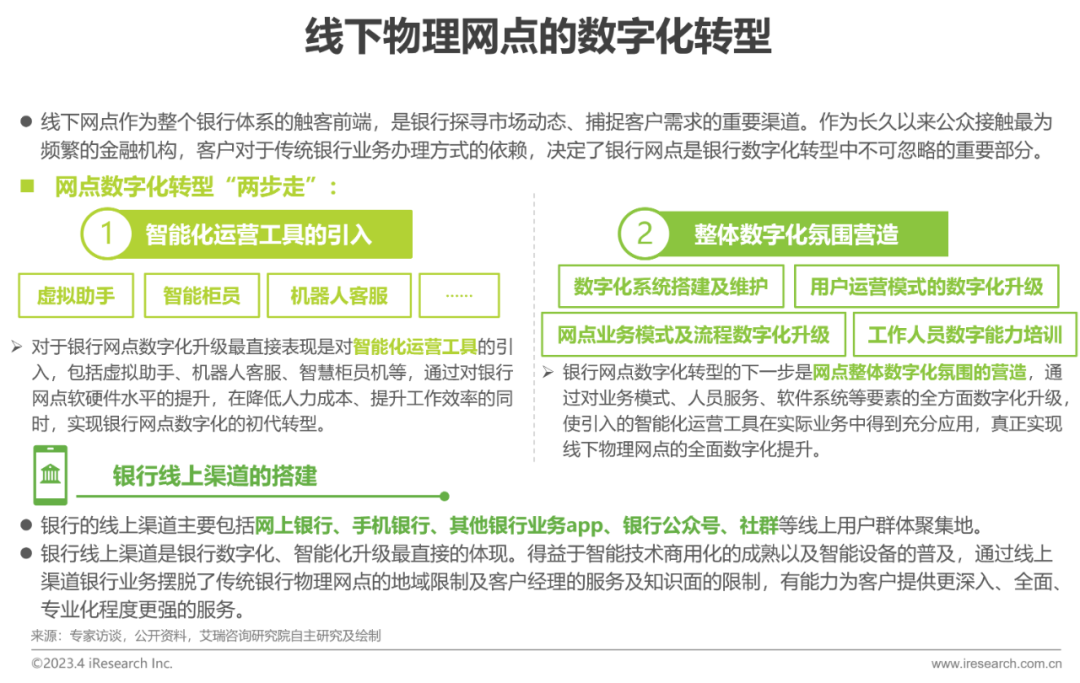 智能工具的引入助力银行线下网点的数字化升级;网银、手机银行等线上平台成为银行线上用户的聚集地