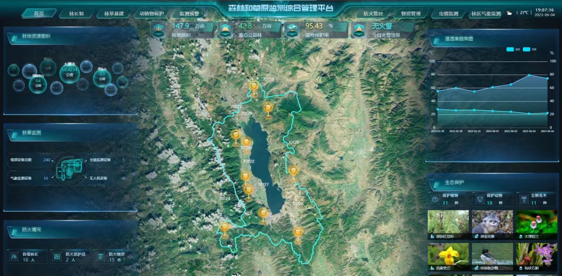 据介绍,大理市林草局利用物联网、边缘计算、云计算、大数据、人工智能等前沿的数字技术,建成智慧林草系统,搭建了一套从终端到边缘到中心的监测预警体系,通过“空、天、地、人”的有机连接,实现实时监测预警和资源统一调度管理。