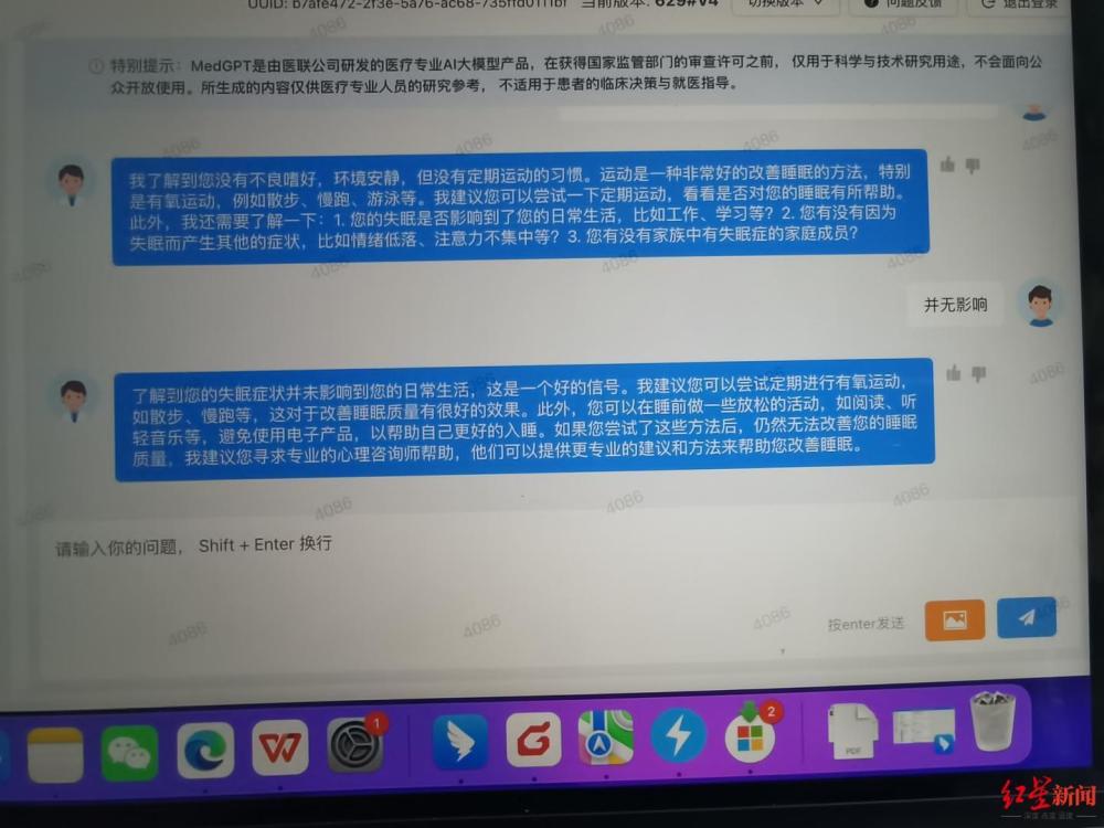 记者发现,如果MedGPT在提出问题后,记者并未回答,则会反复提问。问诊过程中,记者有意将“提醒”错写为“提行”,MedGPT依然可以识别记者真实想表达的含义,进行解答或回复。同时,记者用口语化近义词代替原有的书面词汇,如“失眠”改为“睡不着”等,MedGPT均能理解。经过7分钟的问诊,由于记者的症状不算严重,MedGPT建议暂不需用药,可通过规律运动等方式改善睡眠。