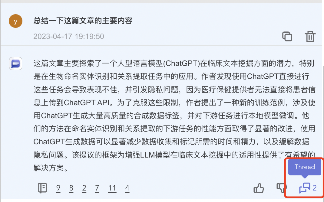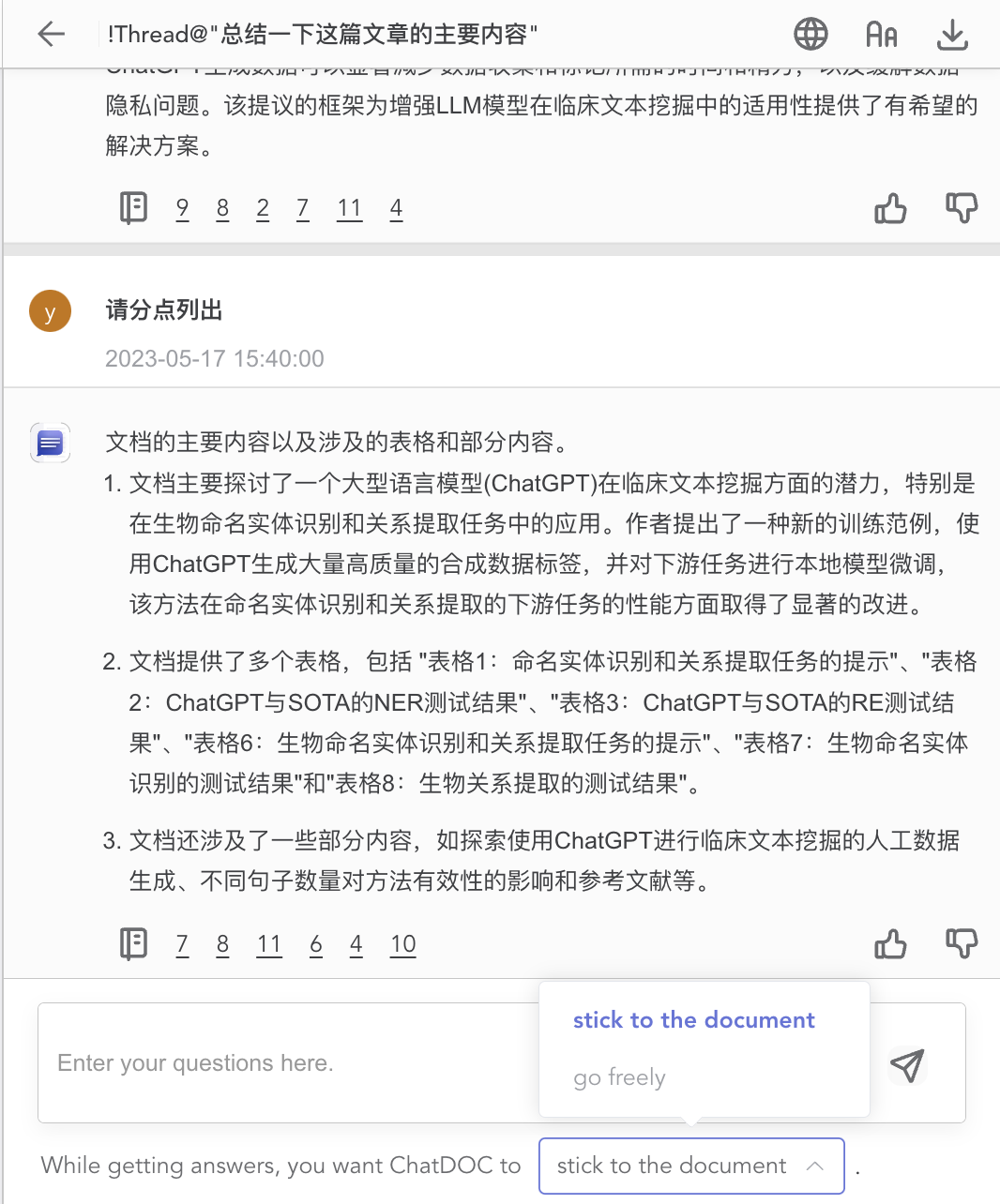 多轮追问:ChatDOC 采用了类似于 Twitter上的「Thread」的概念:你可以针对某一条回答点击多轮会话按钮,开启 Thread,这样的对话记录了关于这个问题的上下文。