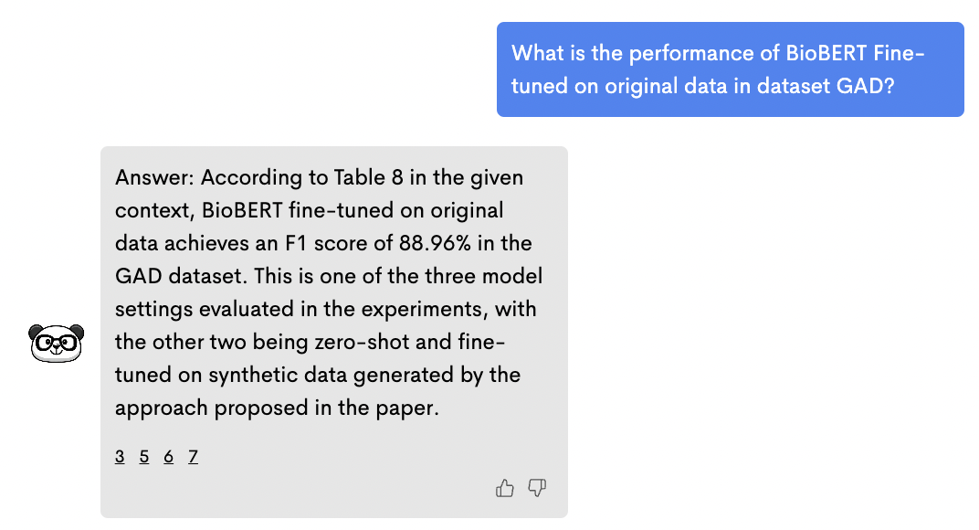 许多 AI 问答类的产品,包括 New Bing,为了规避大语言模型可能的胡说八道,都做了列出引用来源的设计。ChatDOC 的引用做得很精细,回答中每一句话的末尾都给出了来源,且能一一对应;Humata、PandaGPT 的回答整体给出了引用页码,但颗粒度比较粗;而 ChatPDF 暂时没有这样的设计。