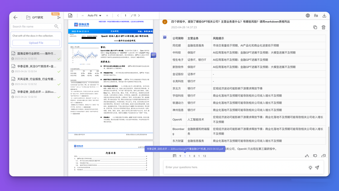 获取信息的质量和速度,决定了我们决策的质量。如果能够「秒读」千百篇文献、指南、政策、规定、招股书、访谈纪要,快速得到大纲或精华内容就好了。最近 ChatDOC、ChatPDF、Humata 等 AI 文档阅读助手就赋予了我们这种能力:直接和单个或多个文档对话,在一问一答之间,化信息为洞察。