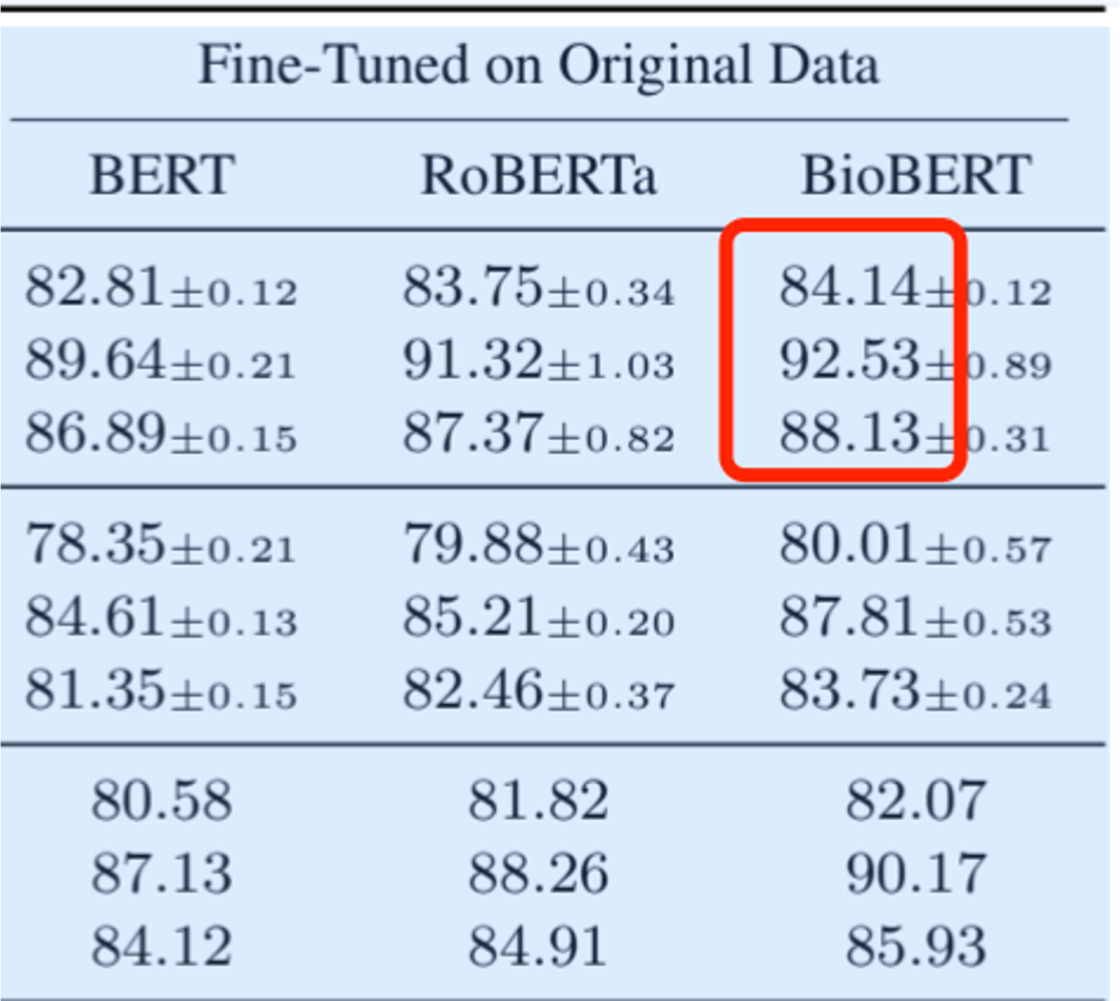 What is the performance of BioBERT Fine-tuned on original data in dataset GAD?