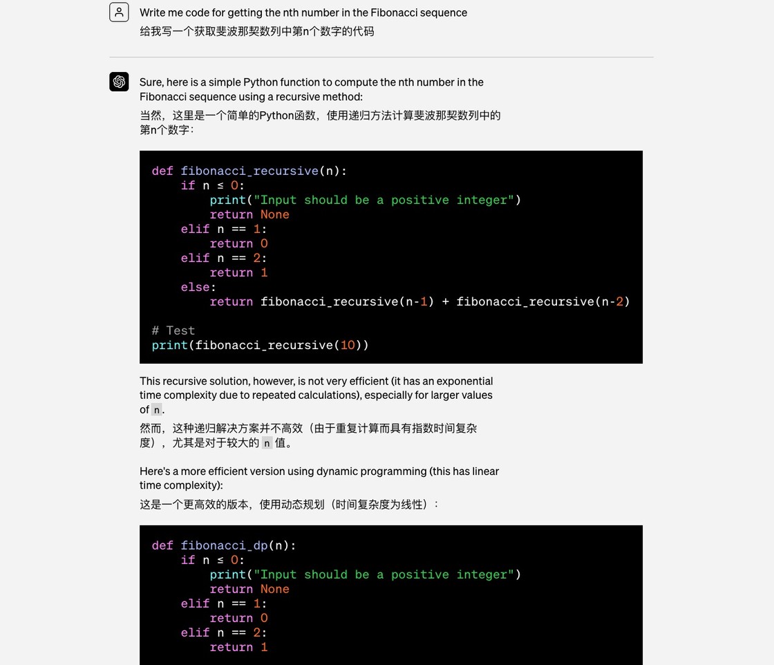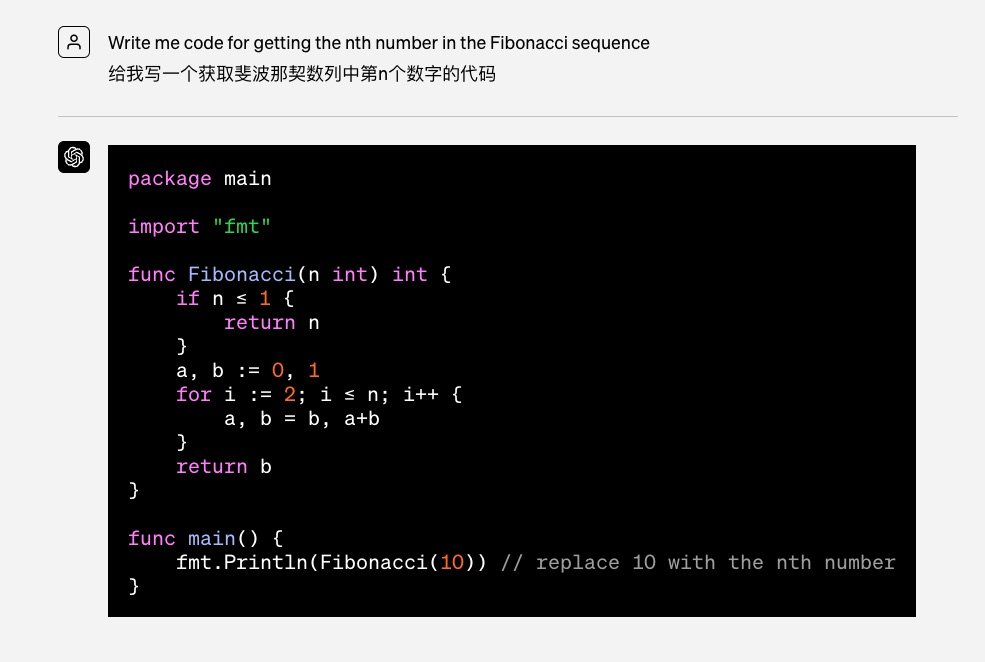 我们来看看 OpenAI 给出的例子。这里用户说「给我写一个获取斐波纳契数列中第 N 个数字的代码」。ChatGPT 的回答,就是用 Go 语言代码回应。