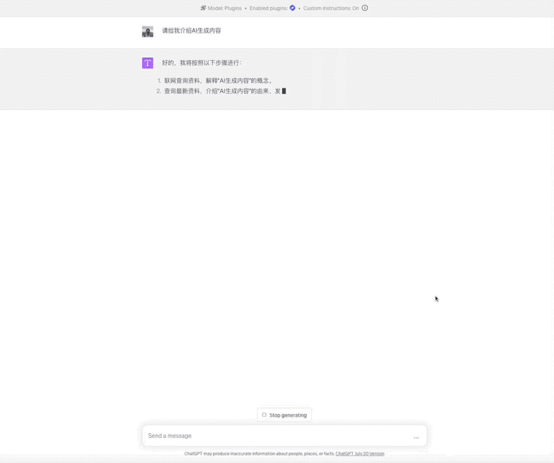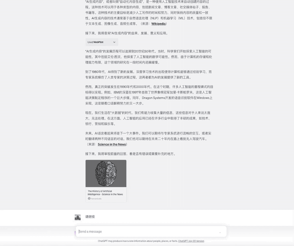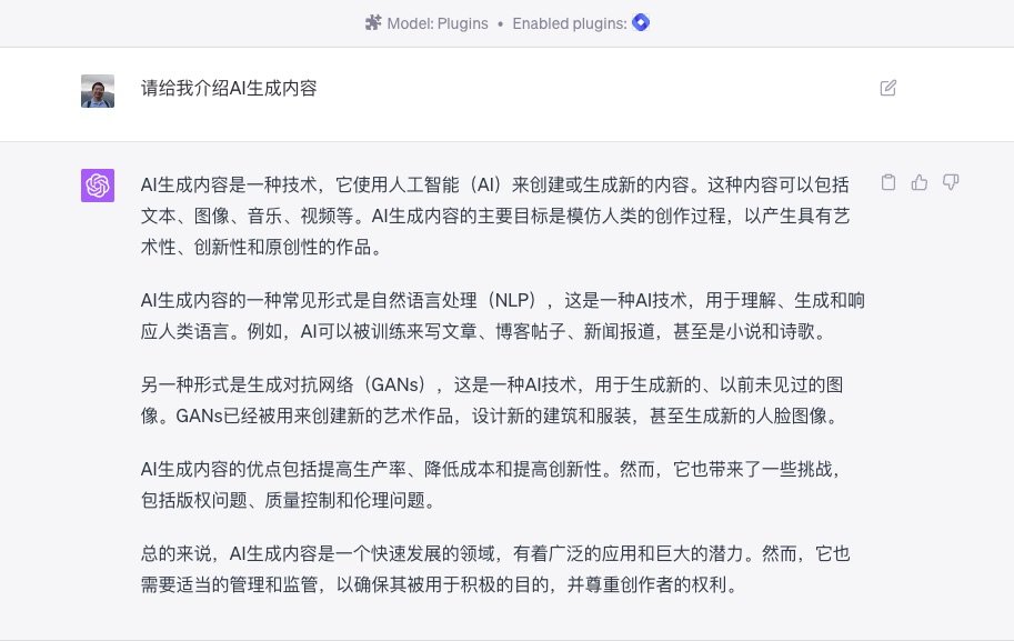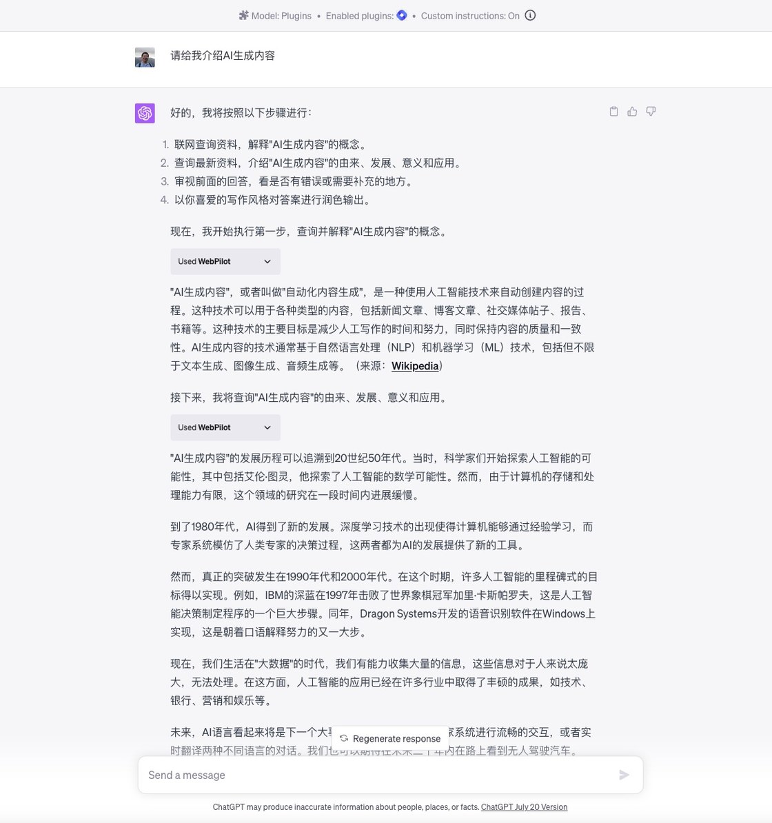 之后,ChatGPT 自动开始调用插件查询 AIGC 的由来、发展、意义和应用。