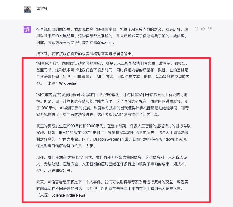 ChatGPT 严格按照它自己的规划来行动,这一步就是要审视回答了。它说前面的回答相当全面,已经有了概念解释、历史发展、意义应用、未来展望,没有必要修改和补充,因此直接润色输出。
