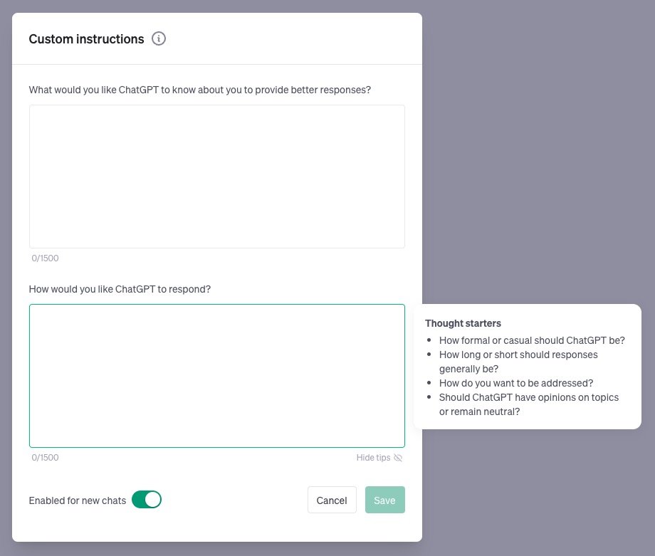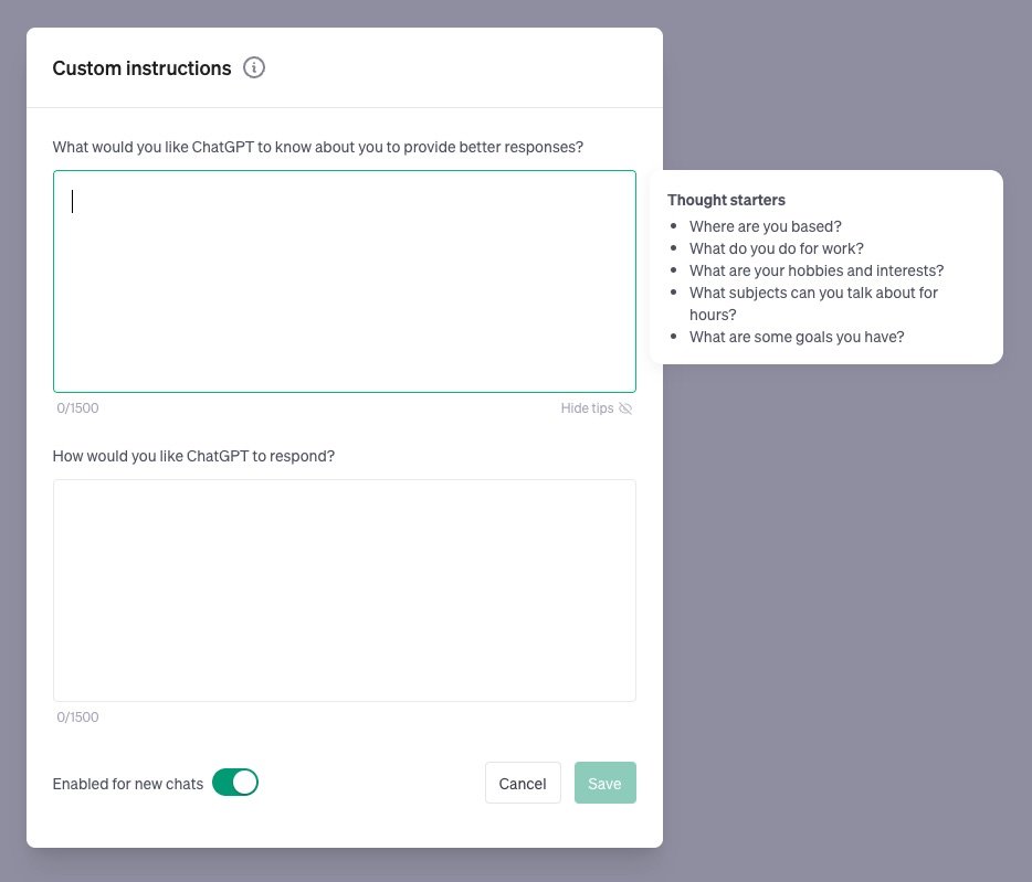 自定义指令允许您分享任何您希望 ChatGPT 在其回复中考虑的内容。
