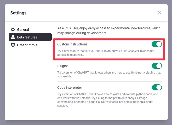 在 ChatGPT 界面左下角菜单栏 Settings & Beta 里面打开 Beta Features,你会看到 Custom Instructions 项目,开启即可。