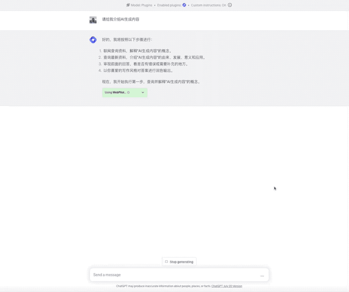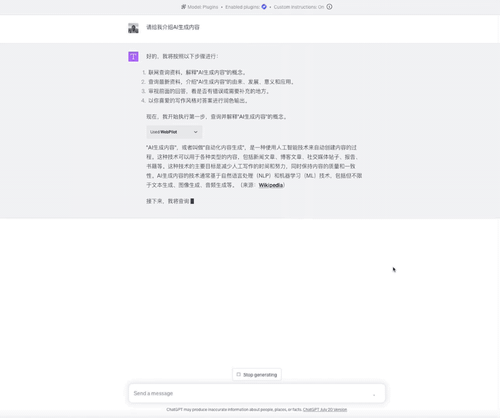 下面开干,ChatGPT 首先调用联网插件 Web Pilot 去对 AIGC 的概念进行查询,并且输出结果。