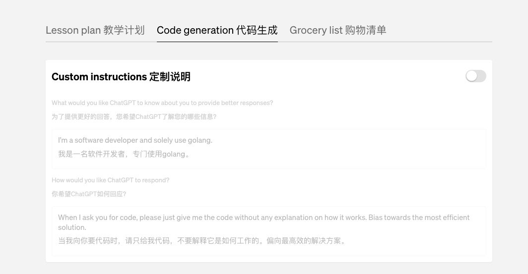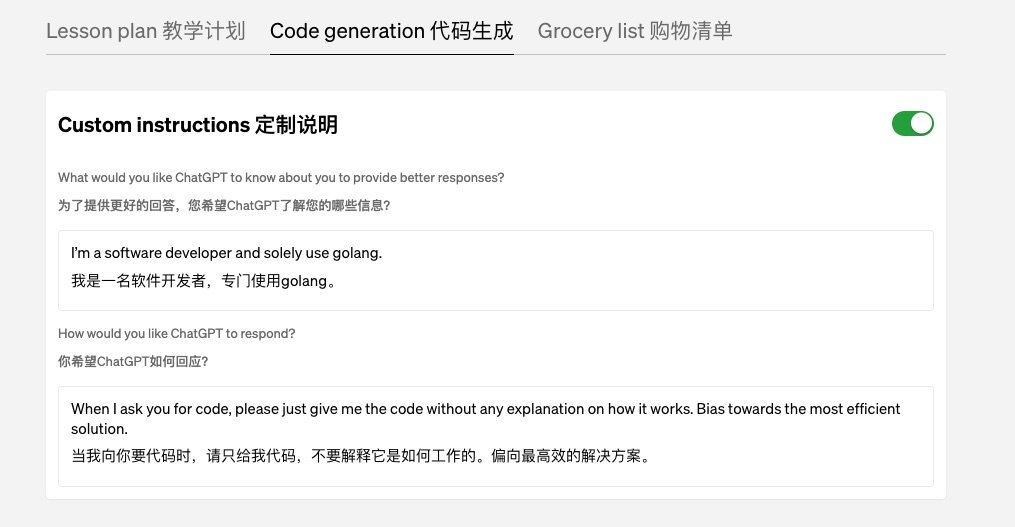 现在不用了。只要用户把 Custom Instructions 开启并且按照上面的样例设定,后面所有的返回代码就都按照他的要求,统一用 Go 语言展示。