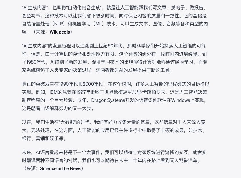 因为有了明确的指引,你会看到 ChatGPT 的输出不再是文章开头演示的那种空洞结果,而是非常具体。回顾历史的时候从 50 年代开始讲起,提到 80 年代转折点,以及 90 年代和 2000 年代的突破等。你会注意到,ChatGPT 讲解完毕后,依然不忘标记来源。这并非 ChatGPT 开了天目突然变聪明,而是我们在 Custom Instructions 里给出了明确而具体的「宏命令」定义。